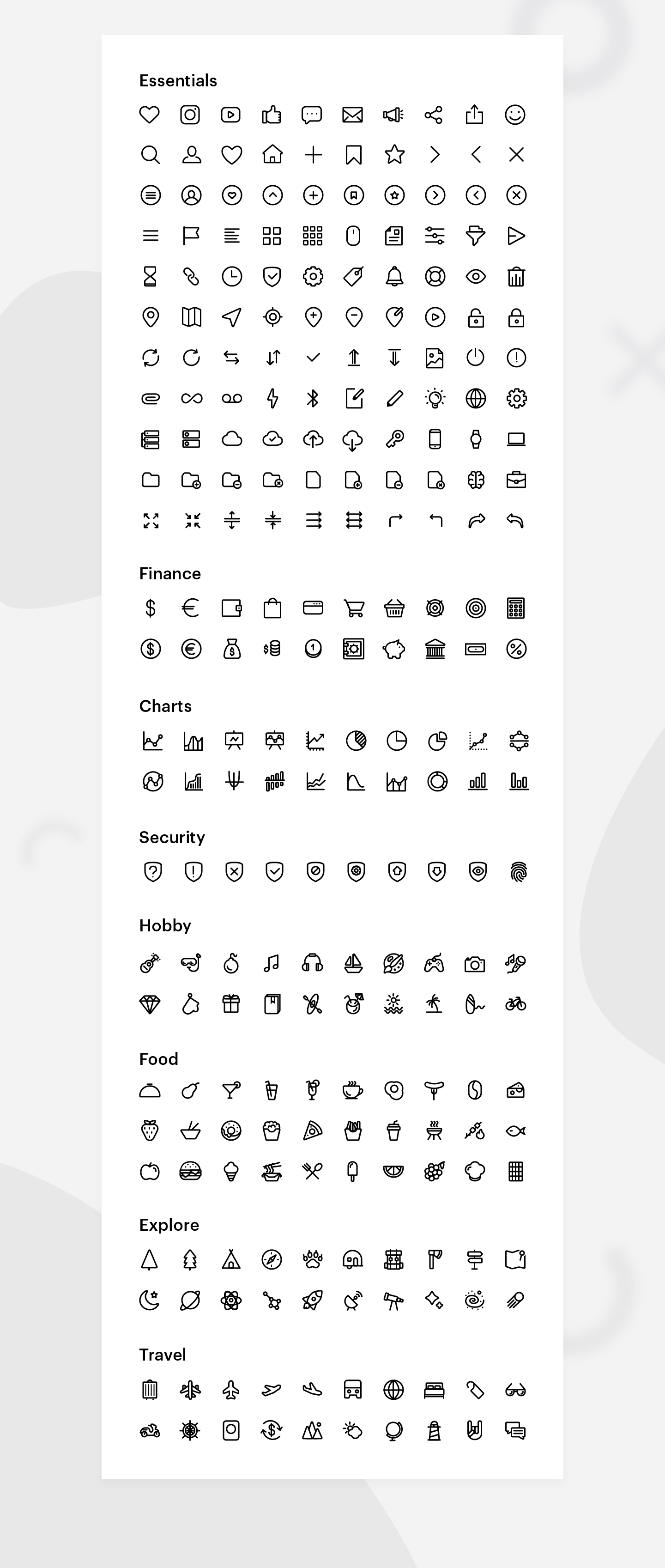 分为6大类,其中250个48x48px图标:要点,社交,财务,图表,安全和爱好,提供的格式也非常丰富AI,EPS,PNG,PSD,Sketch,SVG