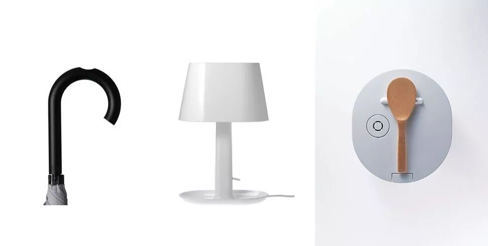 台灯的设计。深泽直人又展示了一款带有托盘的台灯设计。当人们回家的时候会将随身物品例如手表、钥匙、首饰等摘下来自然地放在托盘上,而这个台灯的开关位置就处在托盘往上一点的地方,同时打开这个开关的动作也是由下往上,保证放东西的时候自然而然打开这个台灯,这是交互设计当中非常重要的一点。如果开关放在电线上面,行为会被打破。